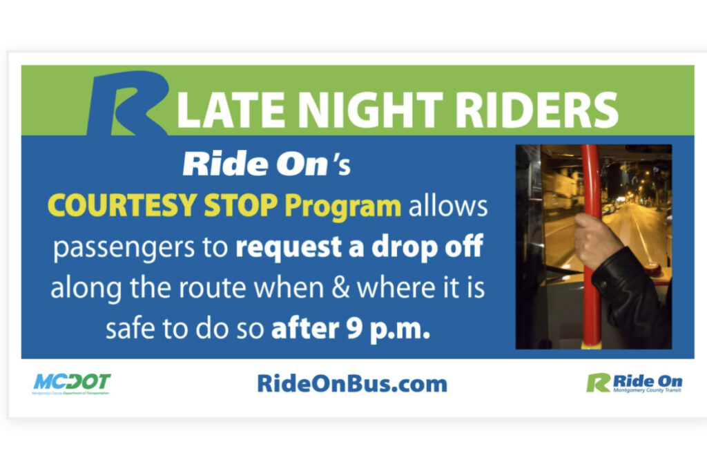 “We don’t anticipate that the Courtesy Stops will have any significant impact on the overall travel times for buses, and it will offer riders an extra level of security at night,” said MCDOT Director Chris Conklin. “With WMATA buses also participating, riders can take advantage of these nighttime options when traveling by bus anywhere in the County.”