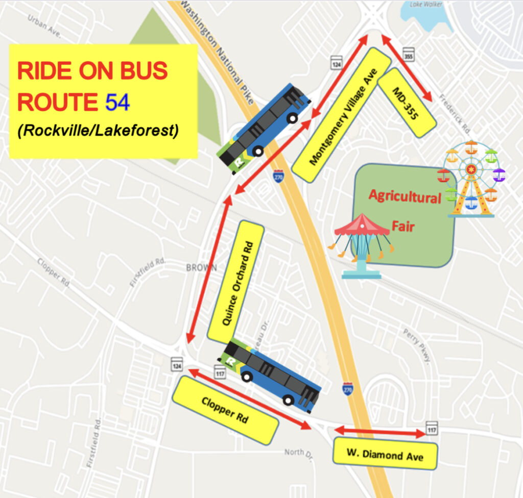 Per MCDOT: Due to the Montgomery County Agricultural Fair, Ride On Route 54 (Rockville-Lakeforest) will experience a detour through Saturday, Aug. 19. The detour will last from 6 p.m. to 11 p.m. on Fridays and Saturdays and from 6 p.m. to 10 p.m. Monday through Thursday. View all routes to the fair here. Details of the detour can be found below.