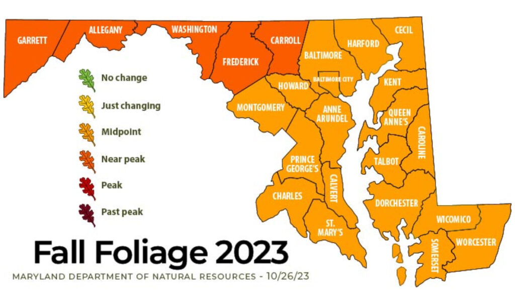 Per the Maryland Department of Natural Resources: With colors intensifying across the state this week, parts of Maryland are right on the cusp of peak leaf change. The mountains of western Maryland are seeing bold shades of amber, crimson and gold, while other regions of our state are reporting marked increases in autumnal hues, spreading further along the tree canopies in central, northern, and southern Maryland. This weekend’s weather promises to bring warmer than average temperatures to the region, and we’re embracing the shift – and the burst in fall color – by including some of our best locations to enjoy a walk in the woods at one of our state parks and forests.