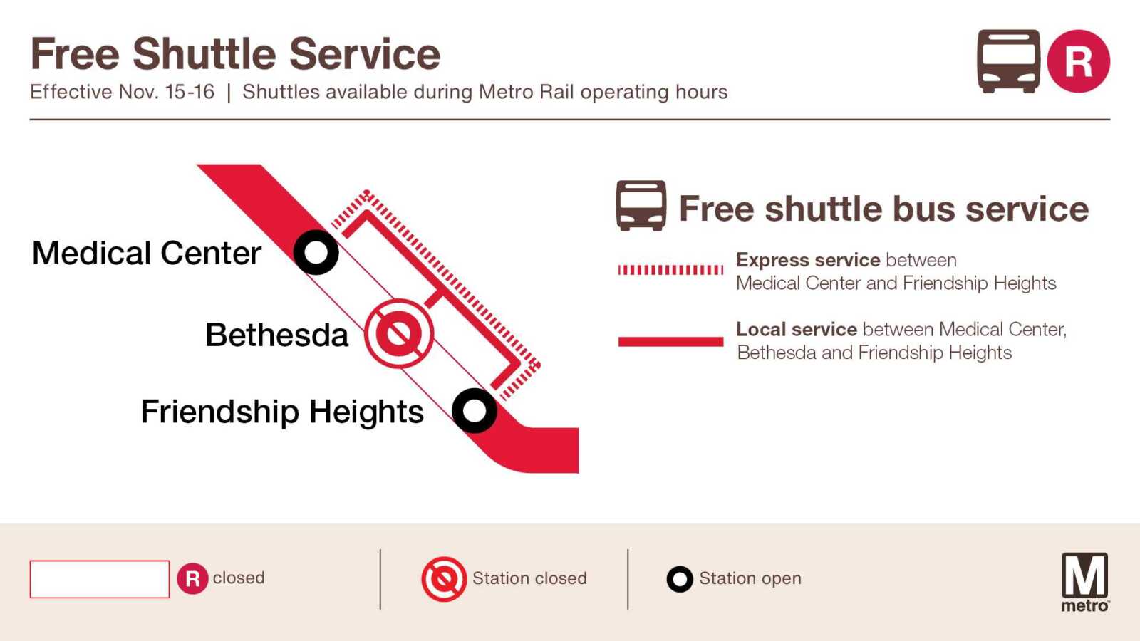 On Saturday, Nov. 15, and Sunday, Nov. 16, Metro will close Bethesda station to support Maryland Department of Transportation’s activities to advance Purple Line construction. Free shuttle buses will replace Red Line trains between Friendship Heights and Medical Center all weekend.