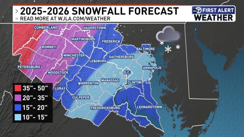 Every year before winter, MoCoSnow looks at the seasonal outlooks released by the major TV networks in our area, and ABC7 has now shared its forecast for the upcoming season. The headline this year: a near-normal winter with 10-20 inches of snow expected for most of the immediate region.
