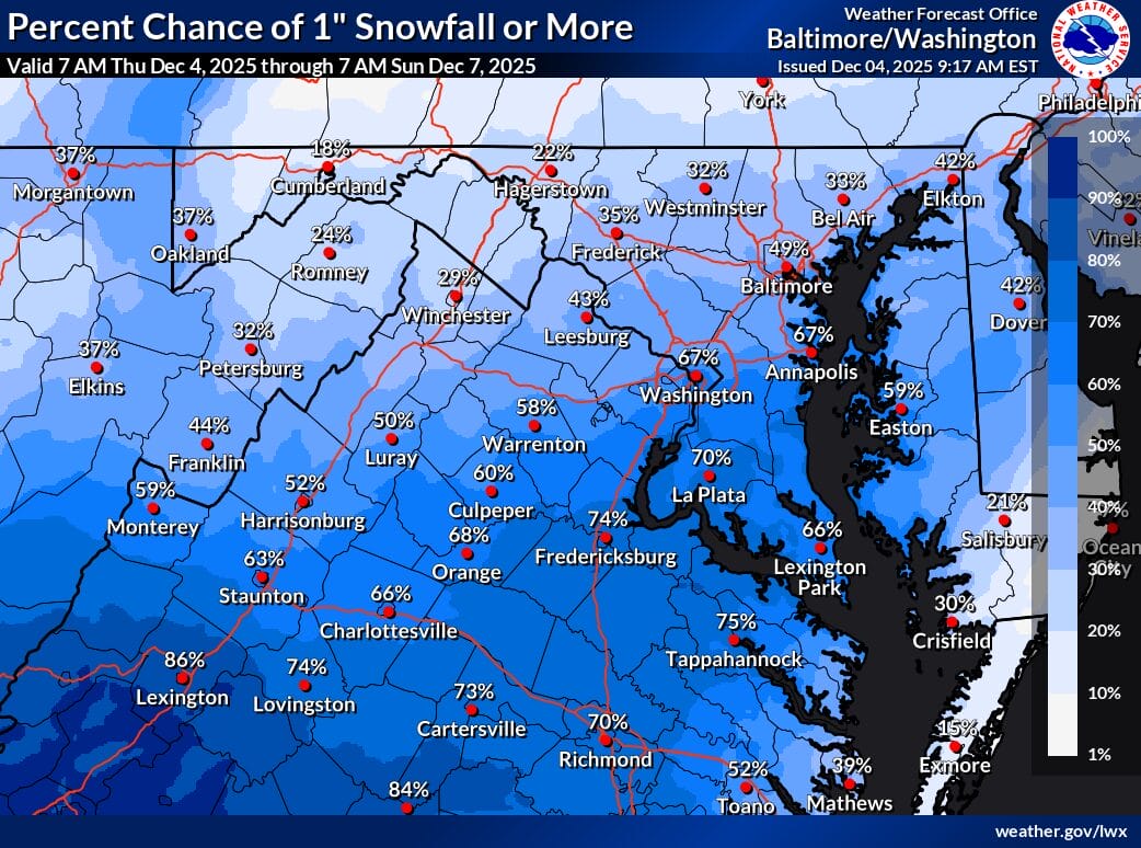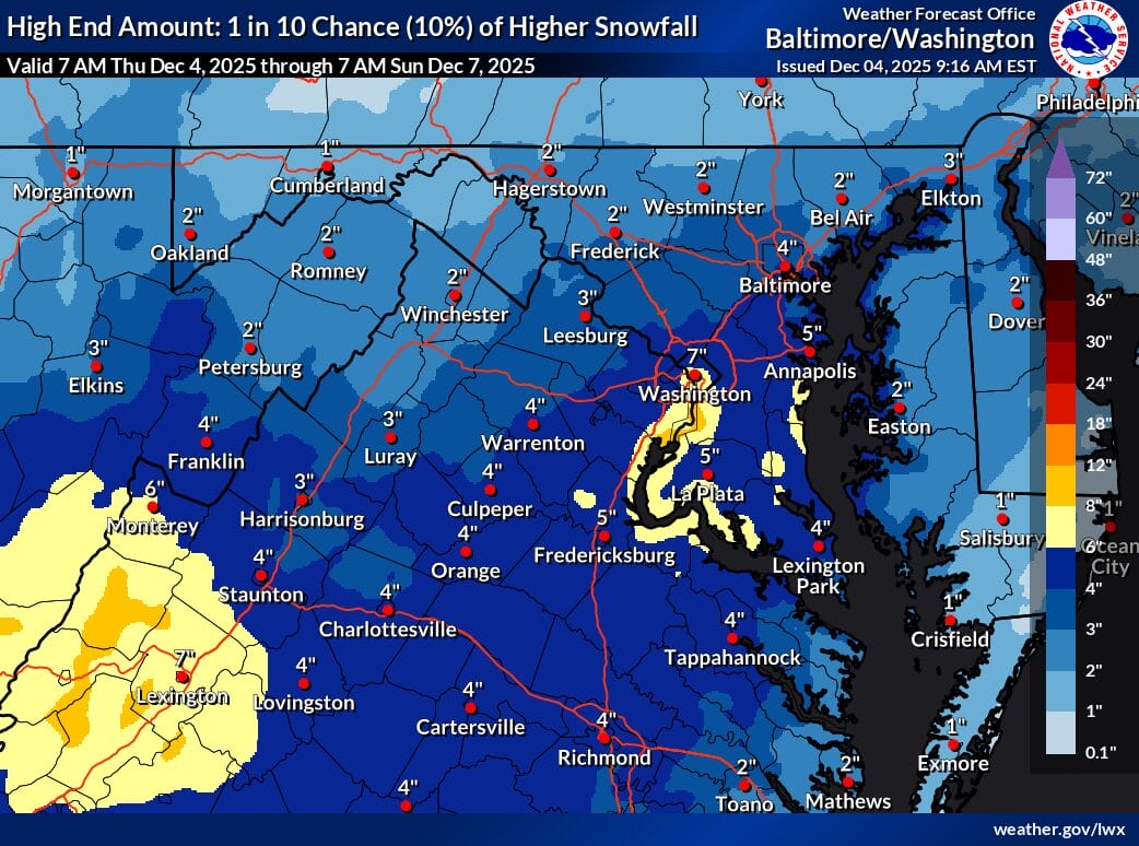 The “high-end” scenario, representing only a 10 percent chance, shows a significantly different picture, with as much as 7 inches indicated over Washington, D.C., and 4 to 5 inches in parts of central Maryland and Annapolis. While this outcome is very unlikely, the NWS includes it to illustrate what could occur if heavier snow bands form or the storm system shifts slightly north.