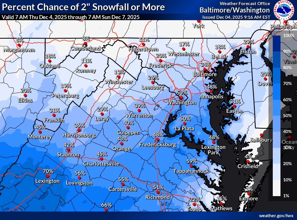However, the NWS probabilistic maps show a much wider range of possible outcomes, emphasizing the uncertainty still in play. The region has a 50 to 67 percent chance of receiving at least one inch of snow, but only about a 20 to 30 percent chance of reaching two inches in the immediate metro area.