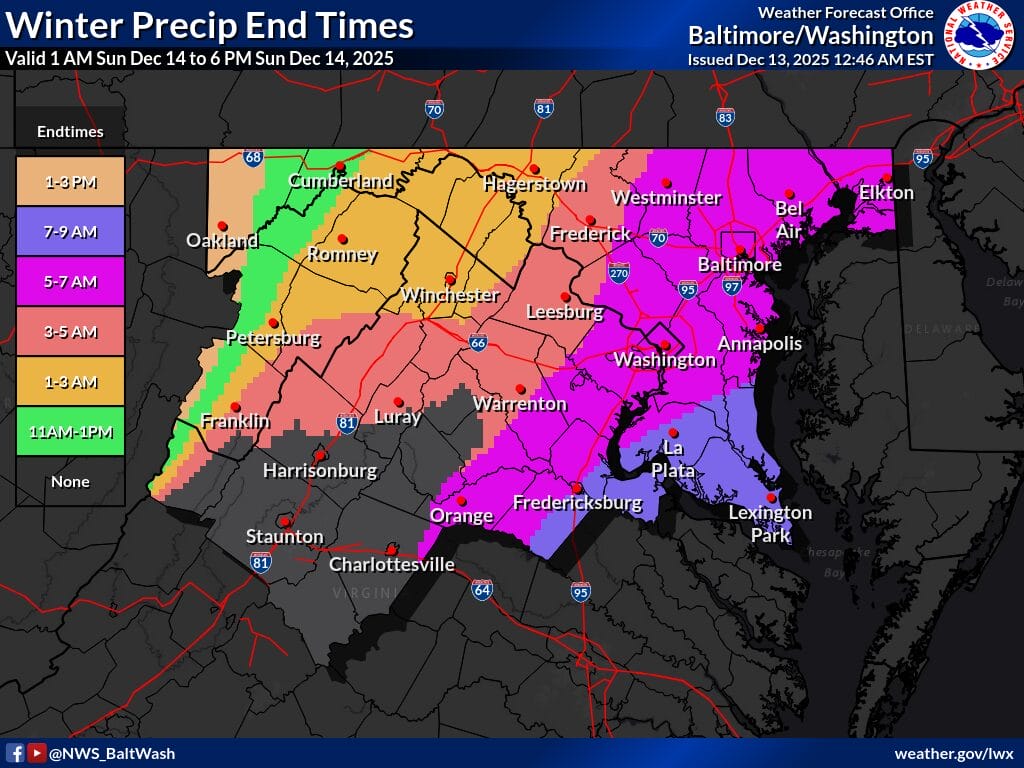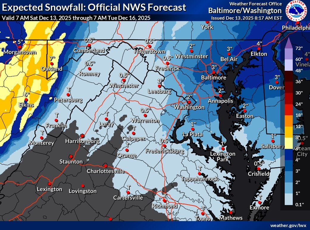 WHAT…Snow expected. Total snow accumulations between 1 and 3 inches. Localized totals of 4 to 5 inches are possible, especially across Baltimore and northeastern Maryland.