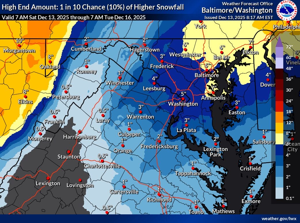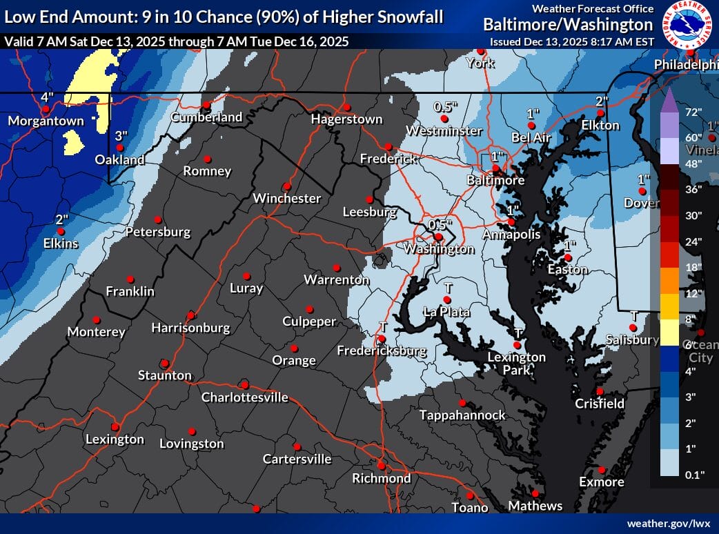 There remains a low-probability but notable upside scenario. The NWS high-end forecast, which represents a 10 percent chance, shows a more widespread 4 to 5 inches of snow across parts of the region. On the opposite end, the low-end scenario, also a 10 percent chance, would result in closer to a half inch of accumulation.