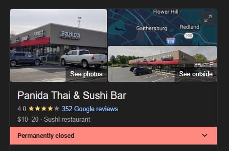 Panida Thai & Sushi Bar at 15106 Frederick Rd Ste C in the College Plaza shopping center in Rockville has closed after an approximate 10.5 year run. The restaurant took over the space that was previously home to Sushi EN in 2015
