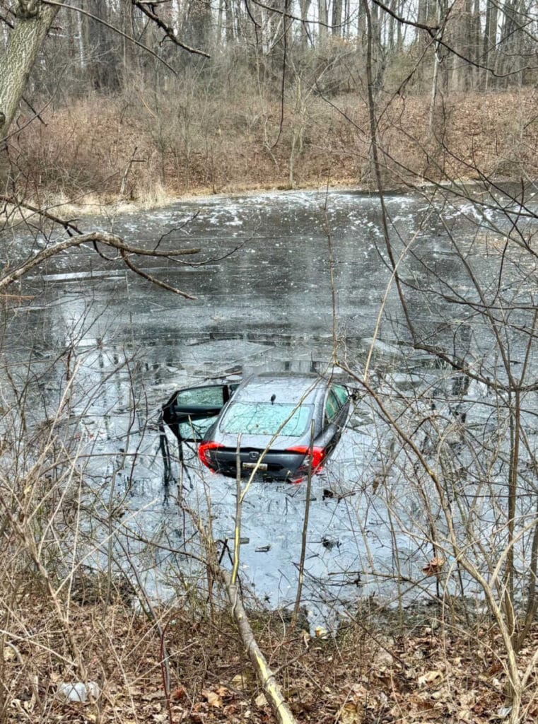 A single-vehicle crash occurred Saturday morning on the southbound I-270 ramp to Montgomery Village Avenue in Gaithersburg, sending a car off the roadway and into an icy pond.