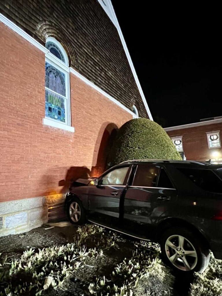 According to Chief Spokesperson for MCFRS Pete Piringer, Montgomery County Fire and Rescue Service units A708 and PE708 were dispatched to the scene. No injuries were reported, and damage to the church was described as minor. A reason for the crash was not provided and the incident remains under investigation.