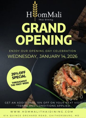 HomMali Thai Dining at 614 Quince Orchard Road in Gaithersburg, next to Quincy’s in the Quince Orchard Plaza shopping center, will hold a soft opening on January 12-13, and a grand opening on January 14, with promotional discounts.