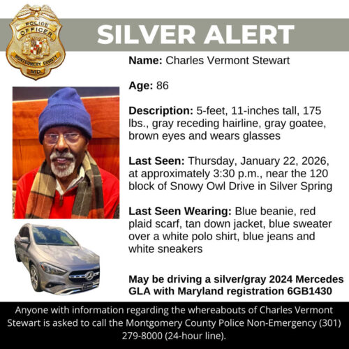 Anyone with information regarding the whereabouts of Charles Vermont Stewart is asked to call the Montgomery County Police Non-Emergency (301) 279-8000 (24-hour line).