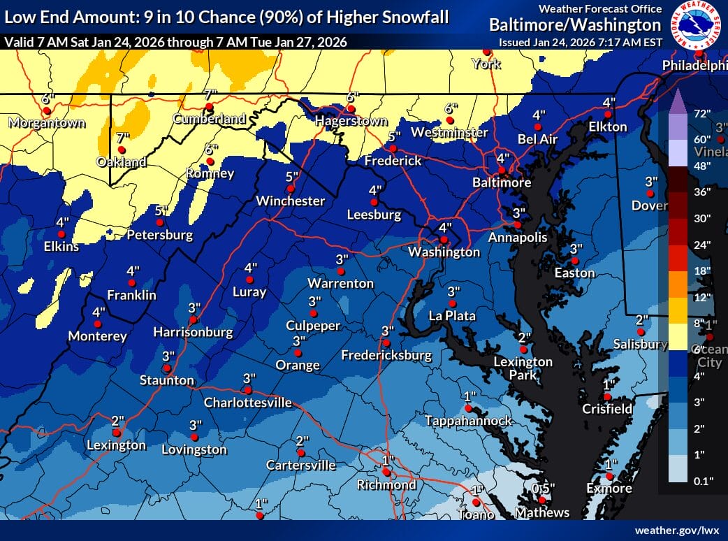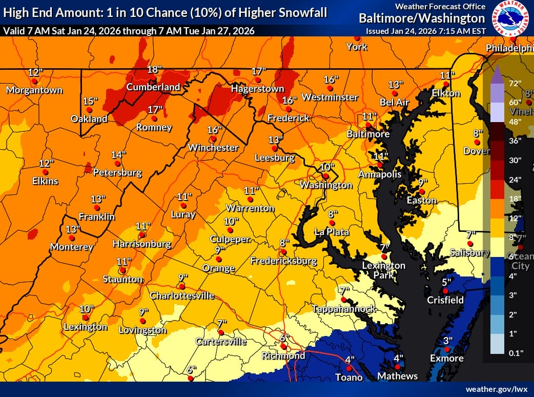 The latest official snowfall forecast from the NWS shows a sharp gradient across the region. Areas closer to Washington, including Bethesda and Silver Spring, are projected to receive around 8 inches of snow, while locations farther north and west, including Damascus and areas closer to Frederick, are forecast closer to 13 inches. The higher end snowfall scenario (map below) shows a 10 percent chance of 10 to 16 inches across much of the area, while the low end scenario (map below) suggests 4 to 6 inches regionwide.