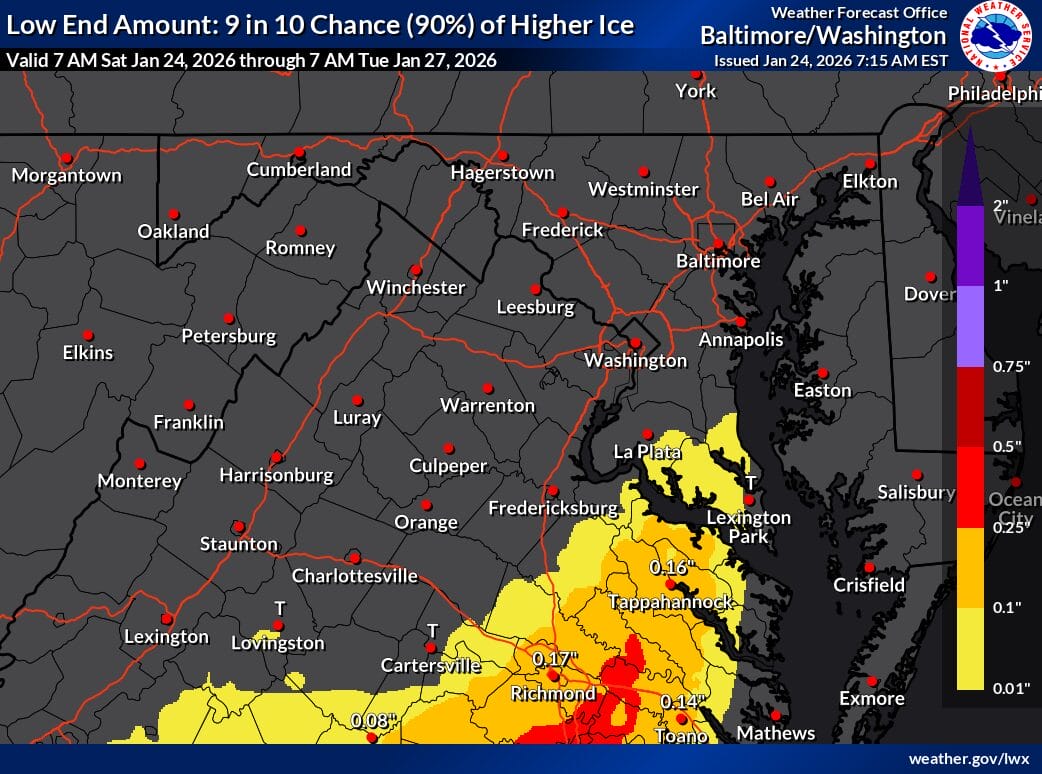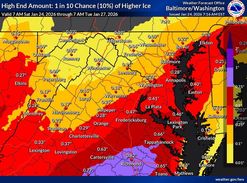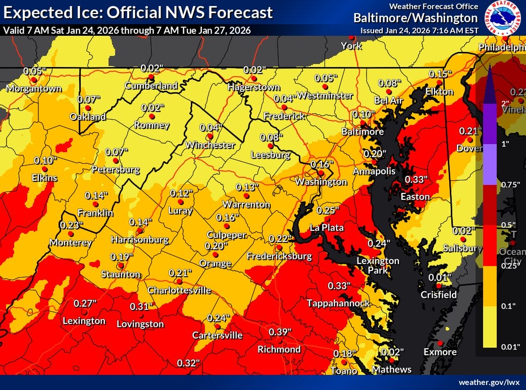 Ice accumulation is a significant concern. Forecasts show about 0.16 inches of ice closer to DC and roughly 0.04 inches farther north. In a worst case scenario, the high end ice forecast shows close to a quarter inch of ice near the District and about a tenth of an inch in northern Montgomery County. While the low end scenario shows little to no ice, forecasters stress that even modest icing could lead to tree damage and power outages, especially when combined with heavy snow.