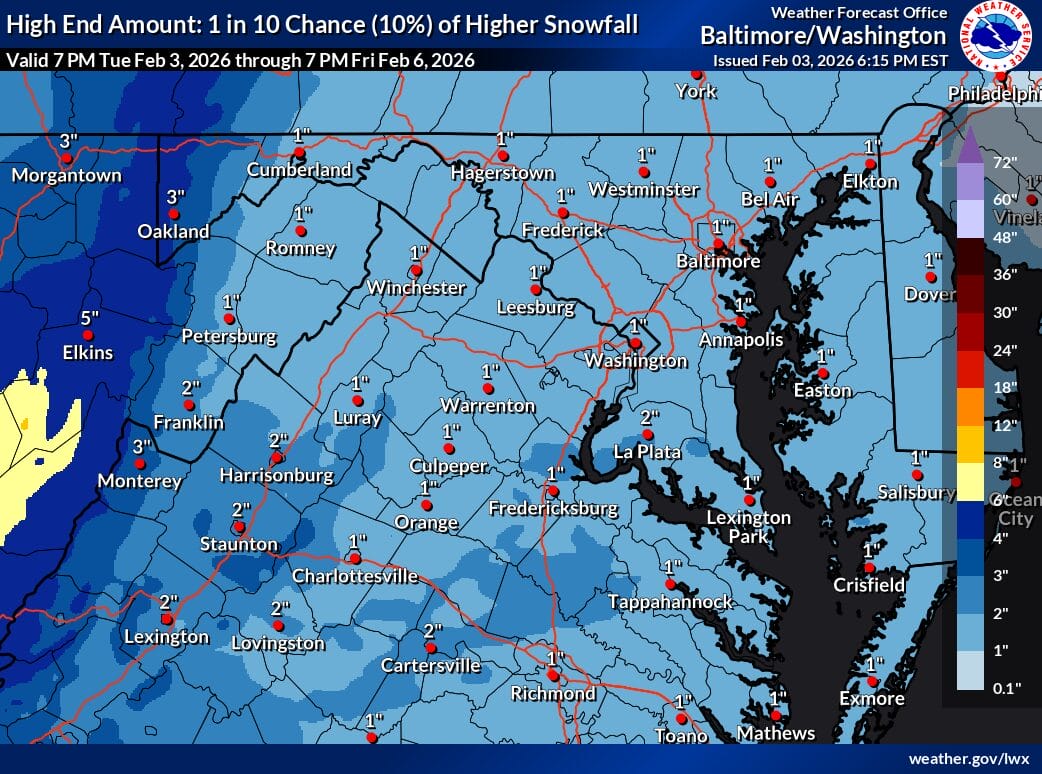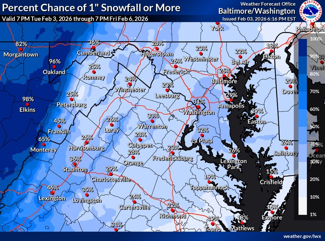 A Special Weather Statement issued by the National Weather Service notes that light snow is likely tonight, with total accumulations ranging from a coating to one inch. The affected areas include the Washington and Baltimore metropolitan regions, northern Virginia, central and southern Maryland, and the Virginia Piedmont.