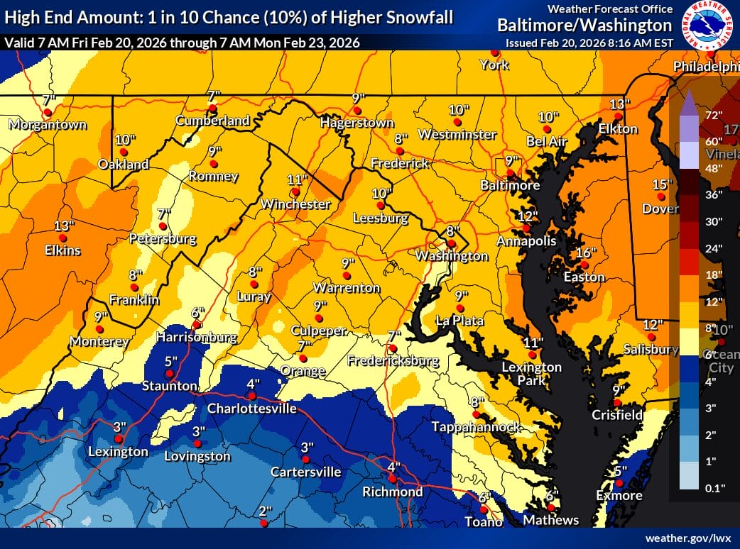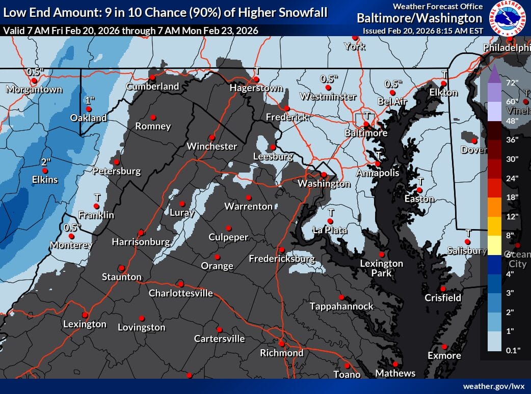 NWS forecasters outline three main scenarios going forward: a storm that develops too late and too far offshore, producing little impact; a weaker offshore system that still brings some snow via an inverted trough; or a stronger low that tracks closer to the Delmarva and produces more widespread snowfall. At this point, none of those scenarios can be ruled out.