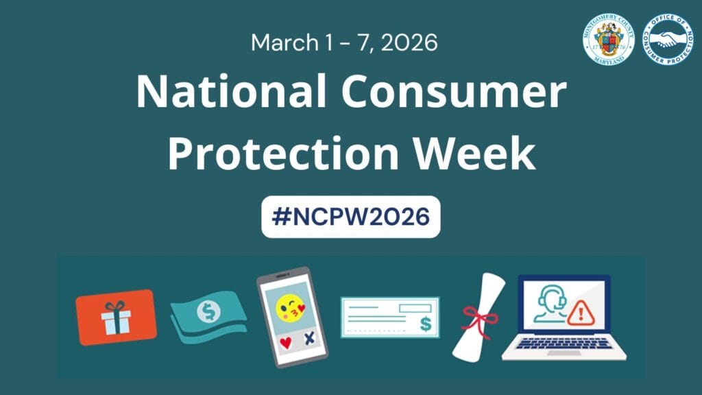 Montgomery County’s Office of Consumer Protection (OCP) will recognize National Consumer Protection Week from Sunday, March 1 through Saturday, March 7 with a series of outreach and education efforts aimed at helping residents avoid scams and make informed purchasing decisions.