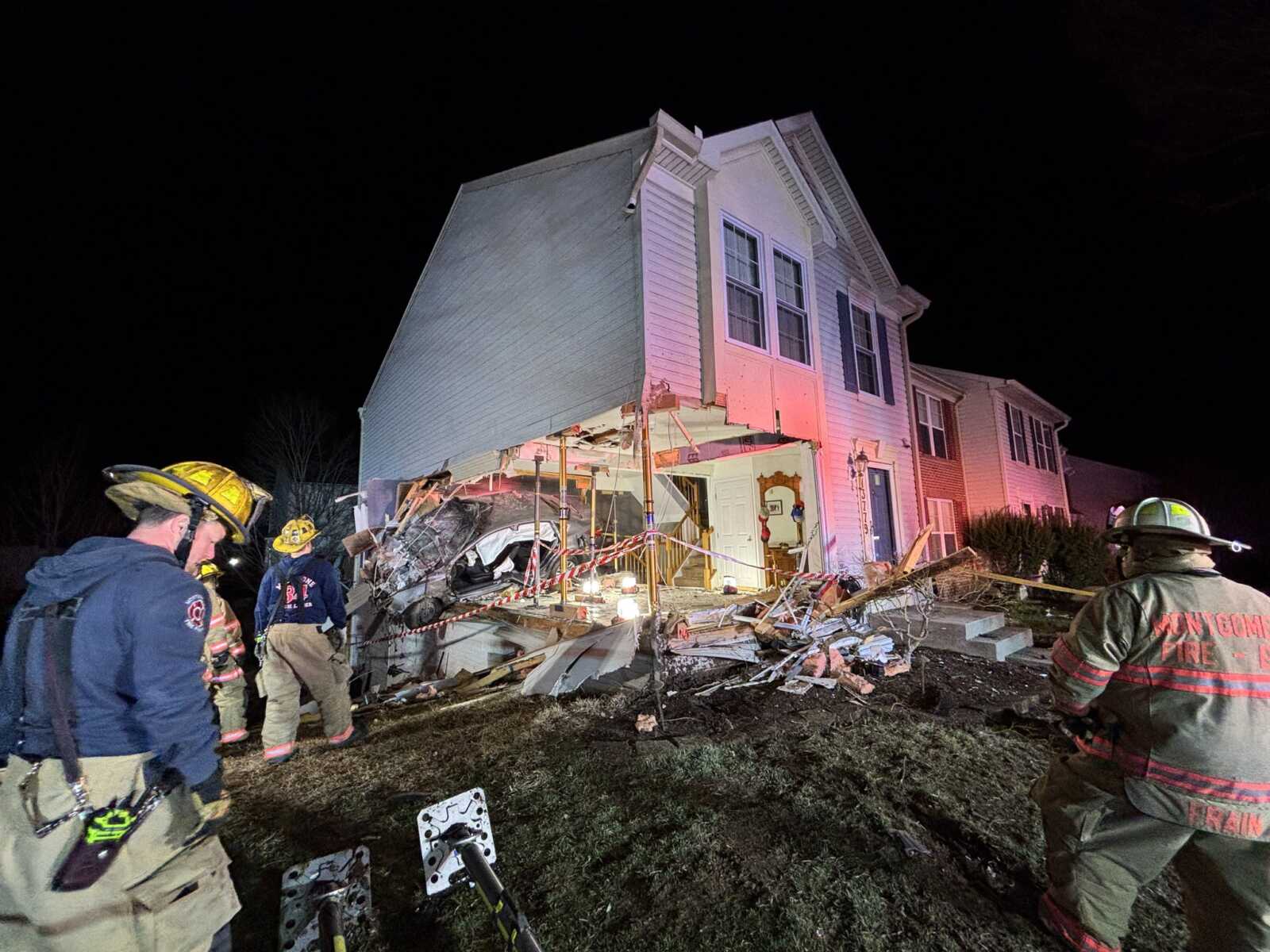 Montgomery County Fire and Rescue Service (MCFRS) units were dispatched around 11:25pm to the 13700 block of Palmetto Circle for a report of a vehicle that had struck a building with a partial collapse. According to MCFRS Captain Franco Martinez, two people were inside the home at the time of the crash but were not injured.