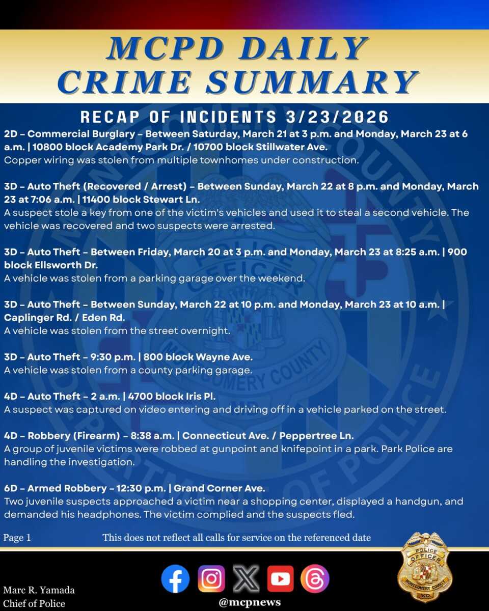 Montgomery County Police shared a summary of reported incidents from March 23, 2026, highlighting multiple auto thefts, a commercial burglary, and several robberies across different districts.