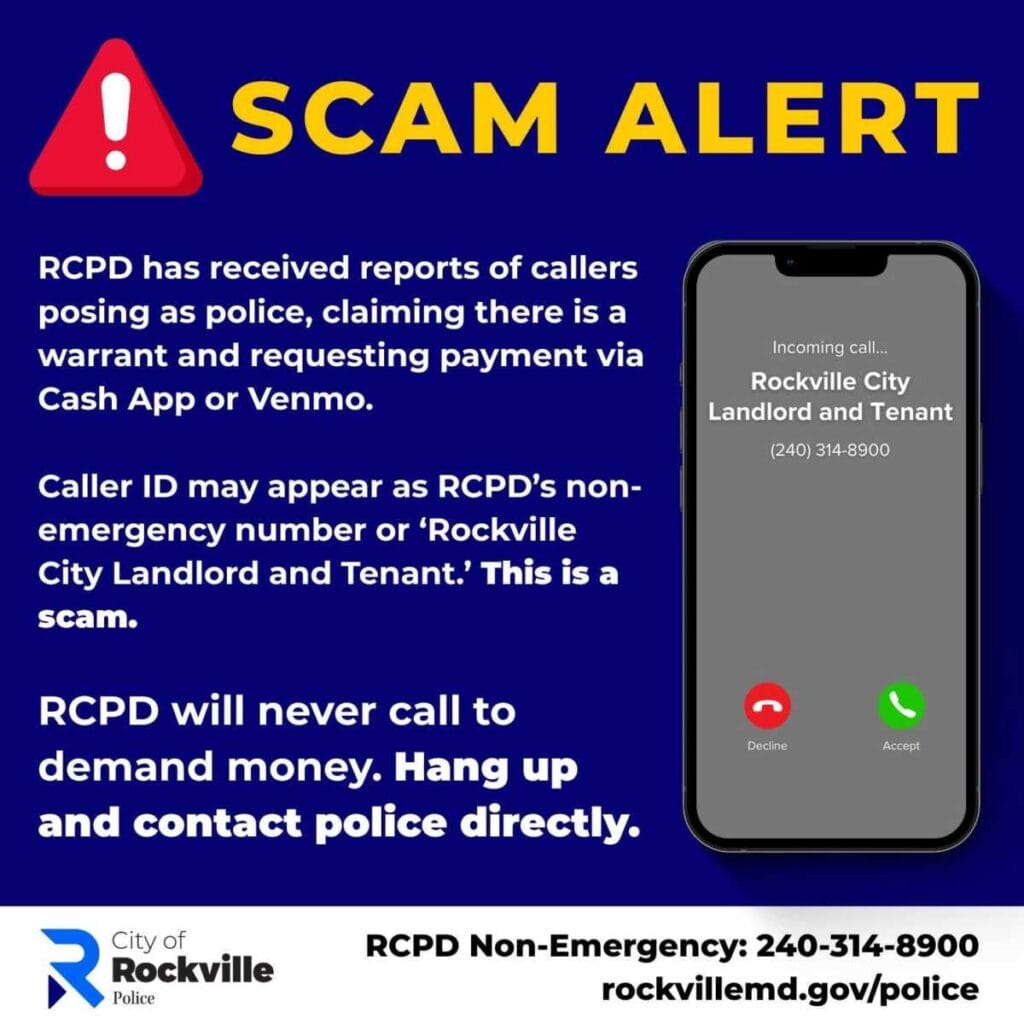 Police emphasize that this is a scam and that they will never call residents to demand payment under any circumstances. Anyone who receives one of these calls is advised to hang up immediately and contact Rockville City Police directly at 240-314-8900.