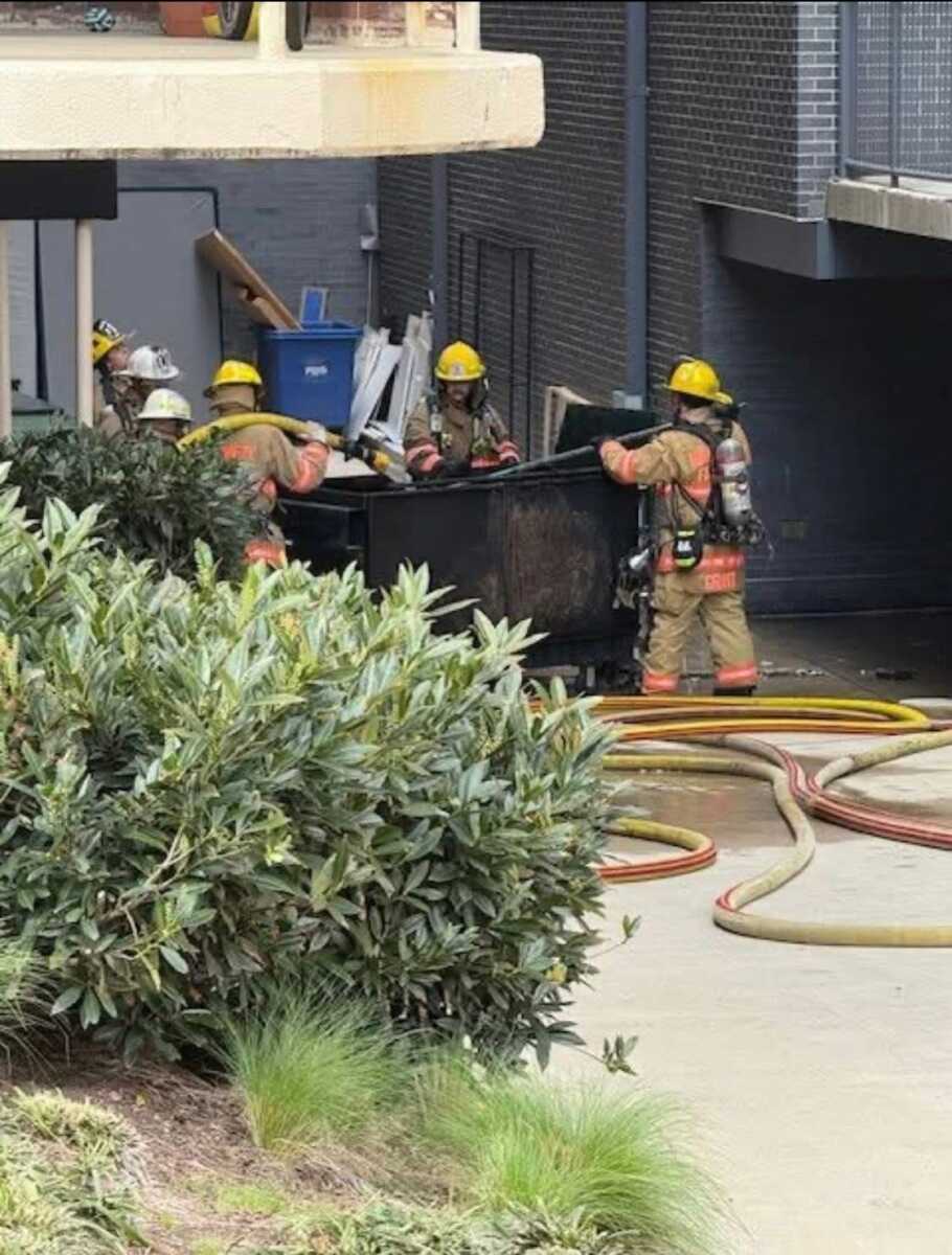 Firefighters quickly worked to investigate and locate the source of the smoke, identifying an active fire involving a trash dumpster inside the building. Crews were able to gain access, extinguish the fire, and conduct a primary search of the affected area to ensure that no occupants were at risk.