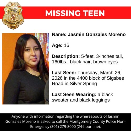 Anyone with information regarding the whereabouts of Jasmin Gonzales Moreno is asked to call the Montgomery County Police Non-Emergency (301) 279-8000 (24-hour line).