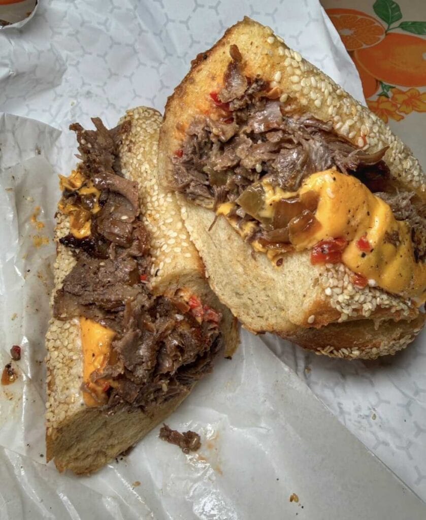 The sandwich features a house-made sesame seed hoagie roll stuffed with ribeye steak, caramelized onions, Cooper Sharp cheese, and sweet red hots. It pays homage to the Dubbaneh family’s long history in Montgomery County’s restaurant scene.