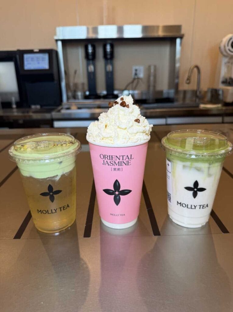 Ahead of the opening, a preview event offered a first look at the menu, where attendees were served complimentary drinks. Among the offerings sampled were the Snowy Jasmine, Pistachio Jasmine Coconut, and Pistachio Champaca Coconut, highlighting the brand’s focus on floral-forward flavors. Molly Tea is known for its signature “Jasmine Whipped Cream Top,” a jasmine-infused foam designed to add a smooth, aromatic layer to its beverages. The menu will feature a range of options including milk teas, matcha drinks, iced teas, and fruit smoothies.