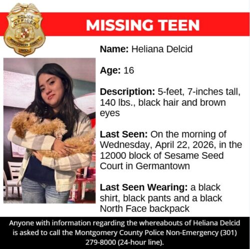 Delcid was last seen on the morning of Wednesday, April 22, 2026, in the 12000 block of Sesame Seed Court in Germantown. She is 5-feet, 7-inches tall, 140 lbs., with black hair and brown eyes. She was last seen wearing a black shirt, black pants and a black North Face backpack.