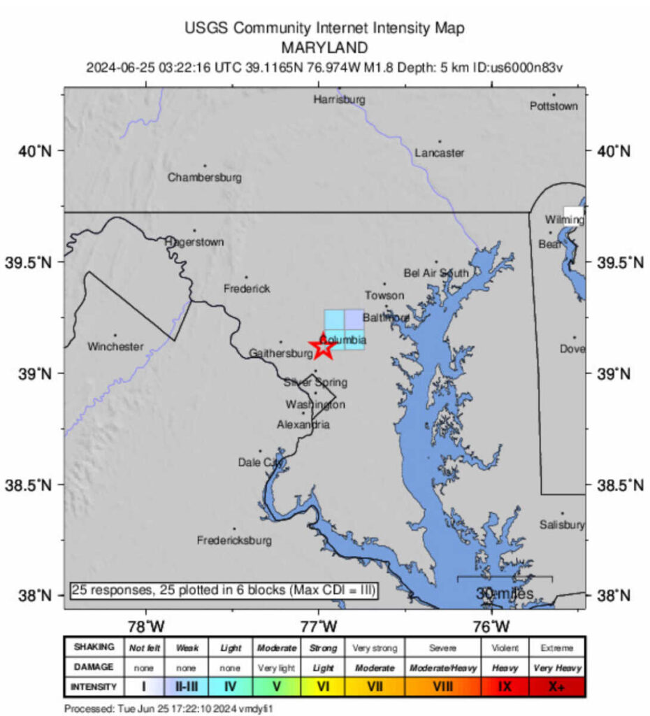 U.S. Geological Survey (USGS) has stated that a 1.8 magnitude earthquake occurred in Spencerville, near Cloverly and Burtonsville, in Montgomery County on Monday Night. USGS reports that the 5.9-depth earthquake occurred shortly before 11:30 pm on Monday night near Spencerville, Maryland.