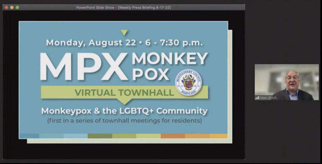Montgomery County Executive Marc Elrich and other representatives from the County Government who help lead the County’s ongoing COVID-19 response efforts hosted their weekly, virtual media briefing at 12:30 p.m. on Wednesday, Aug. 17. The full video can be seen below (begins at 10:06)