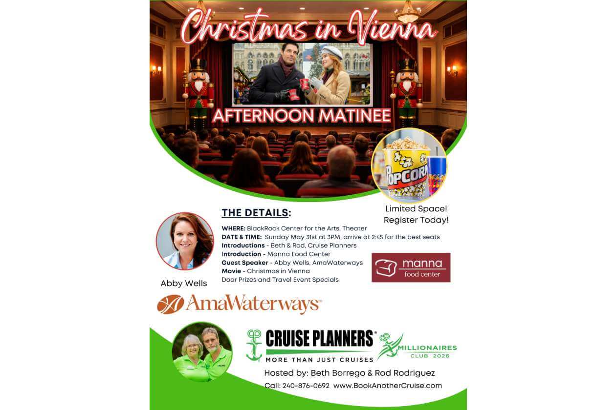 Light refreshments will be served, and guests can participate in a raffle benefiting Manna Food Center. A $5 per person donation is requested, with Cruise Planners Beth & Rod proudly matching donations up to $500. Non-perishable food donations are also welcome.