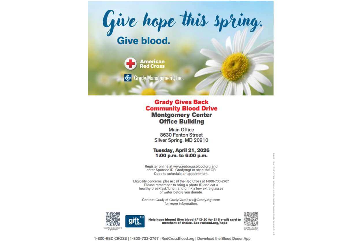 We are partnering with American Red Cross to host a community blood drive on April 21 in Silver Spring, and we would appreciate any opportunity to help spread awareness.